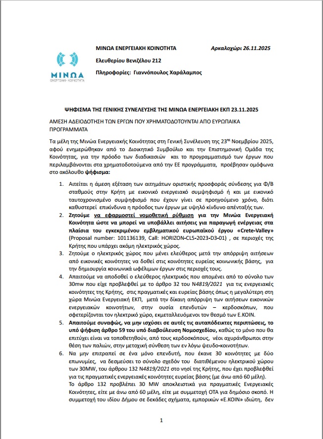 Τα μέλη της Μινώα Ενεργειακής Κοινότητας στη Γενική Συνέλευση της 23ης Νοεμβρίου 2025, αφού ενημερώθηκαν από το Διοικητικό Συμβούλιο και την Επιστημονική Ομάδα της Κοινότητας, για την πρόοδο των διαδικασιών και το προγραμματισμό των έργων που περιλαμβάνονται στα χρηματοδοτούμενα από την ΕΕ προγράμματα, προέβησαν ομόφωνα στο ακόλουθο ψήφισμα: